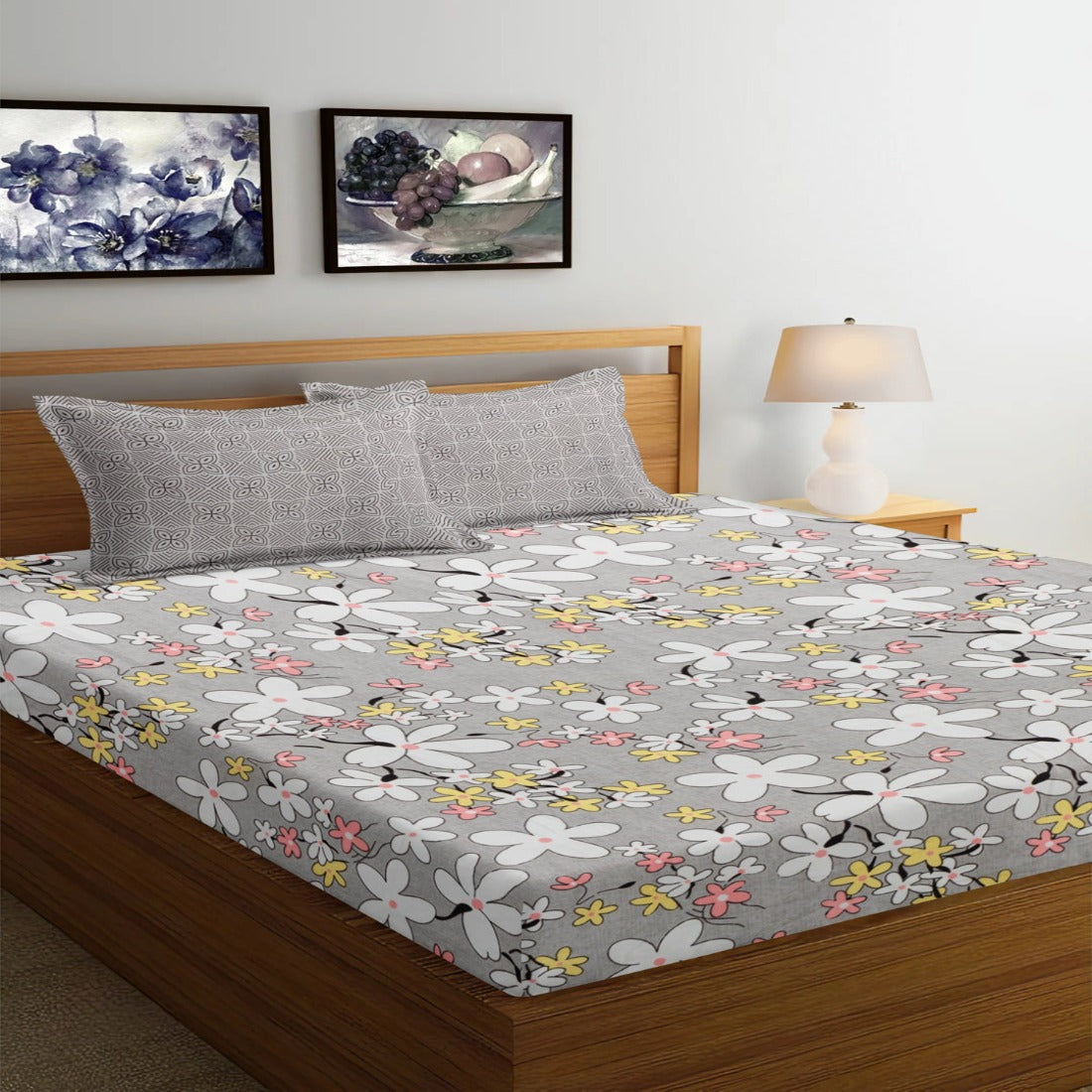 Ash Flower Cotton Blend Elastic Fitted King Bedsheet