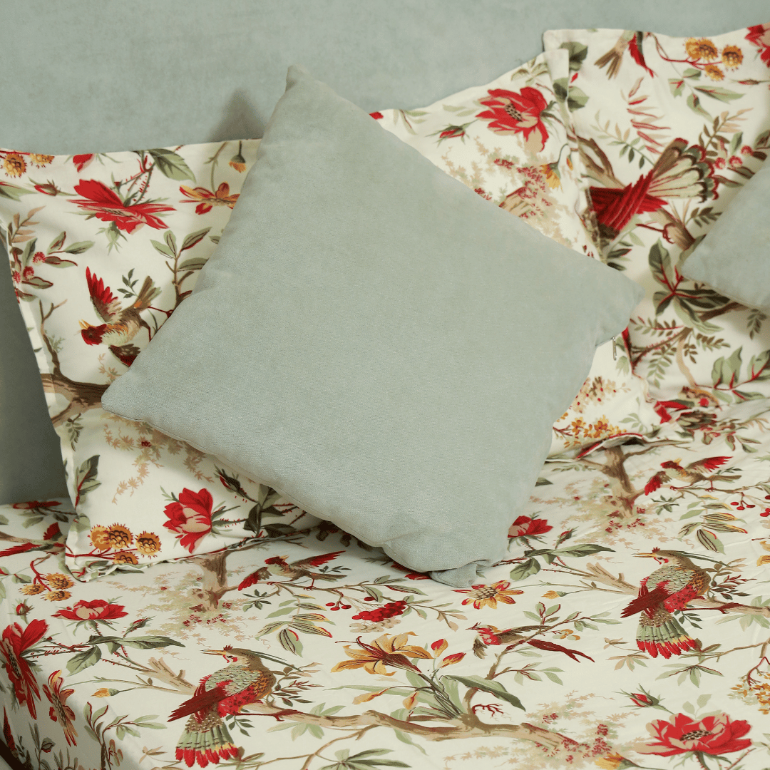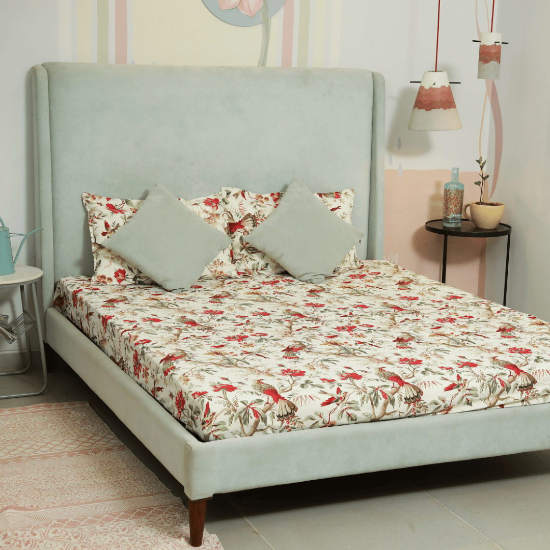 Tropical All Over Printed Cotton Elastic King Size Bedsheet - Red Bird