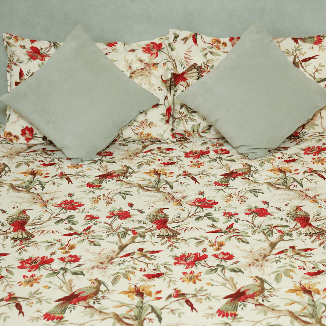 Tropical All Over Printed Cotton Elastic King Size Bedsheet - Red Bird