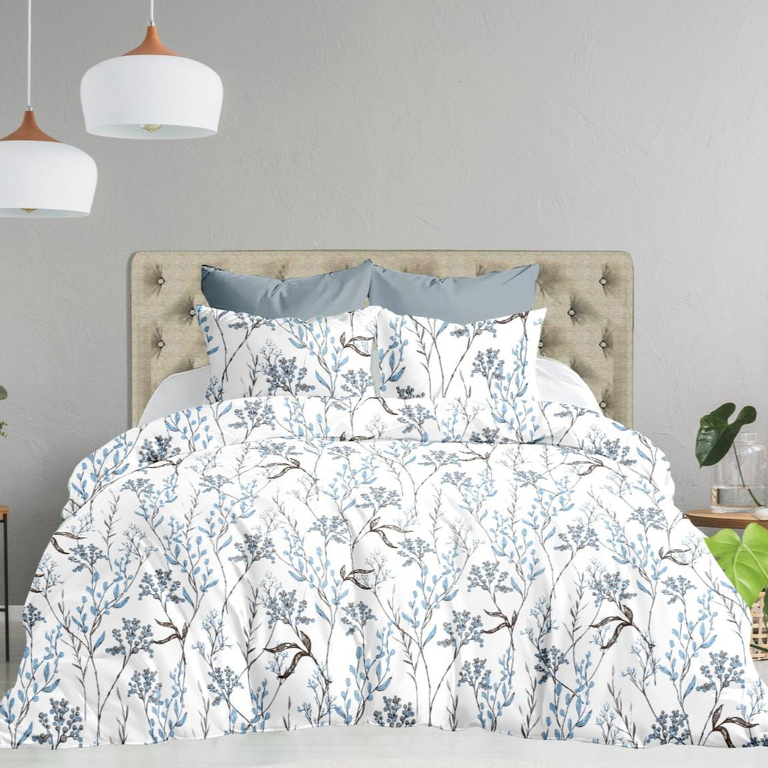 Snowhite All Over Printed 100% Cotton Elastic King Size Bedsheet - Blue Leaves