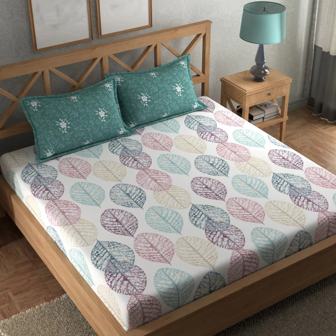 Multicolor Leaflet Cotton Blend Super King Bedsheet with 2 Pillow Covers (108x108 inches)
