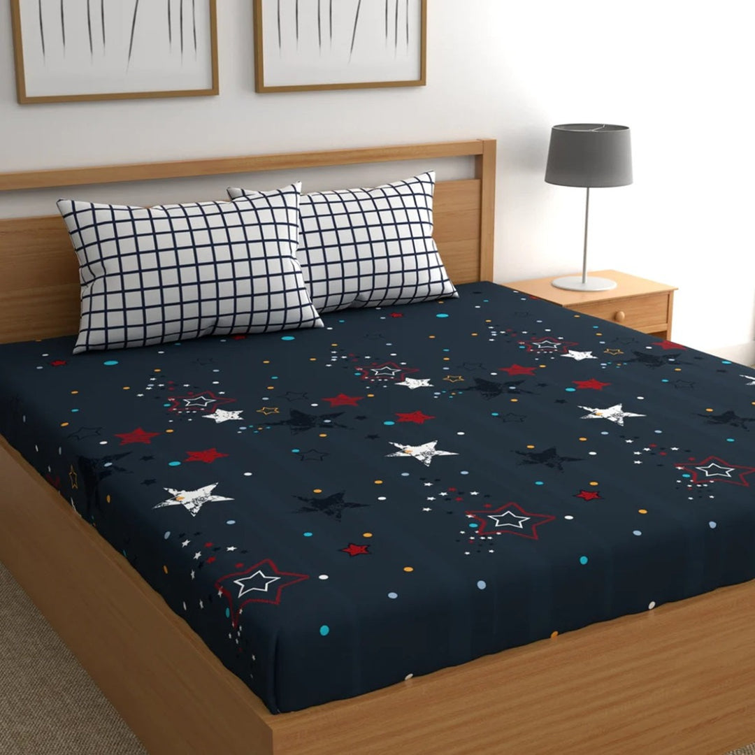 Navy Blue Star Cotton Blend Super King Bedsheet with 2 Pillow Covers (108x108 inches)