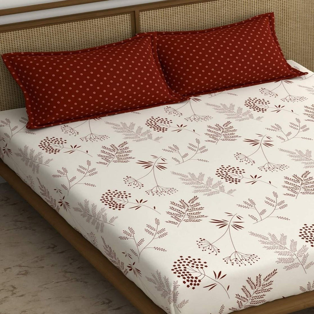 Maroon Leaf Cotton Blend Super King Bedsheet with 2 Pillow Covers (108x108 inches)