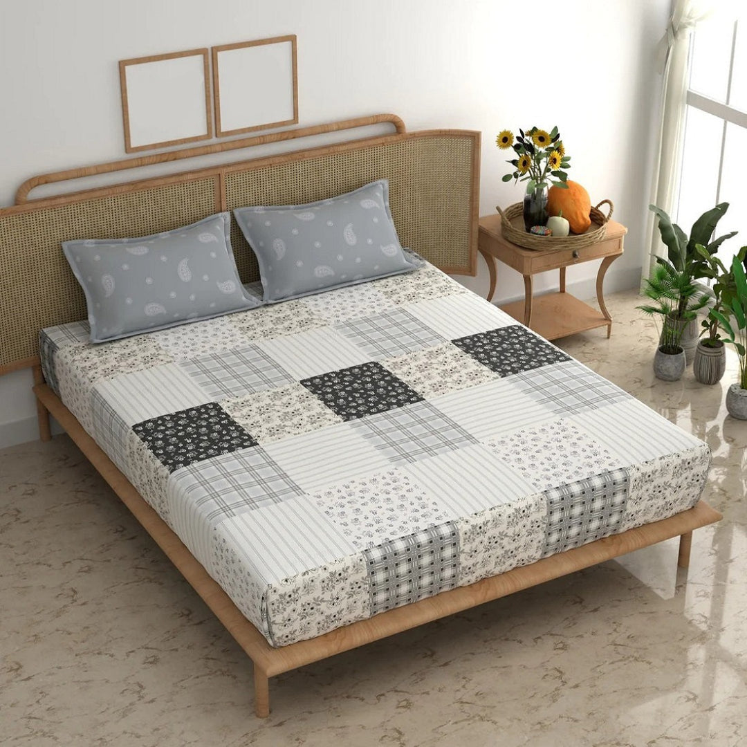 Grey Checks Cotton Blend Super King Bedsheet with 2 Pillow Covers (108x108 inches)