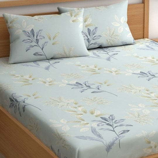 Blue Leaflet Cotton Blend Super King Bedsheet with 2 Pillow Covers (108x108 inches)
