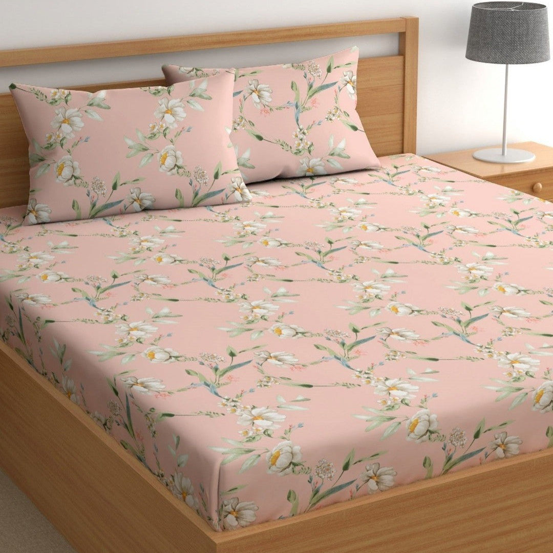 Pink Floral Cotton Blend Super King Bedsheet with 2 Pillow Covers (108x108 inches)
